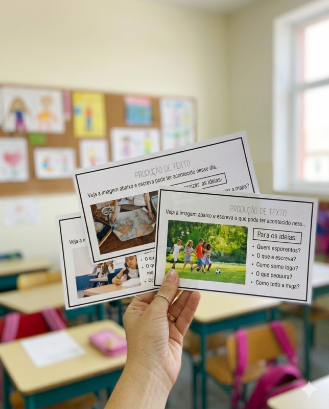 Esse material é ótimo para trabalhar produção de texto de forma guiada. Pode ser usado após leitura de imagem ou como atividade de escrita no caderno. Ajuda os alunos a organizarem ideias e desenvolverem começo, meio e fim da história .